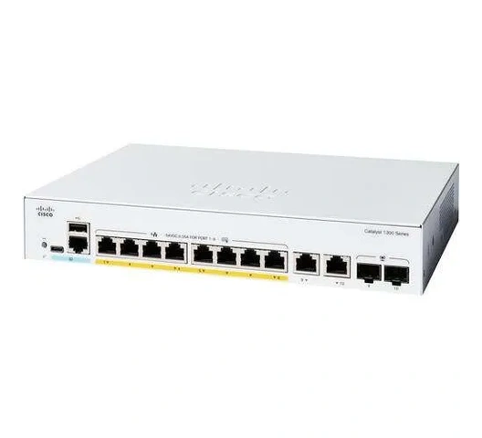 Cisco C1300-8P-E-2G Switch with 8 Gigabit PoE+ ports and 2 combo SFP uplinks. Managed Layer 2 features and flexible connectivity for small business networks.